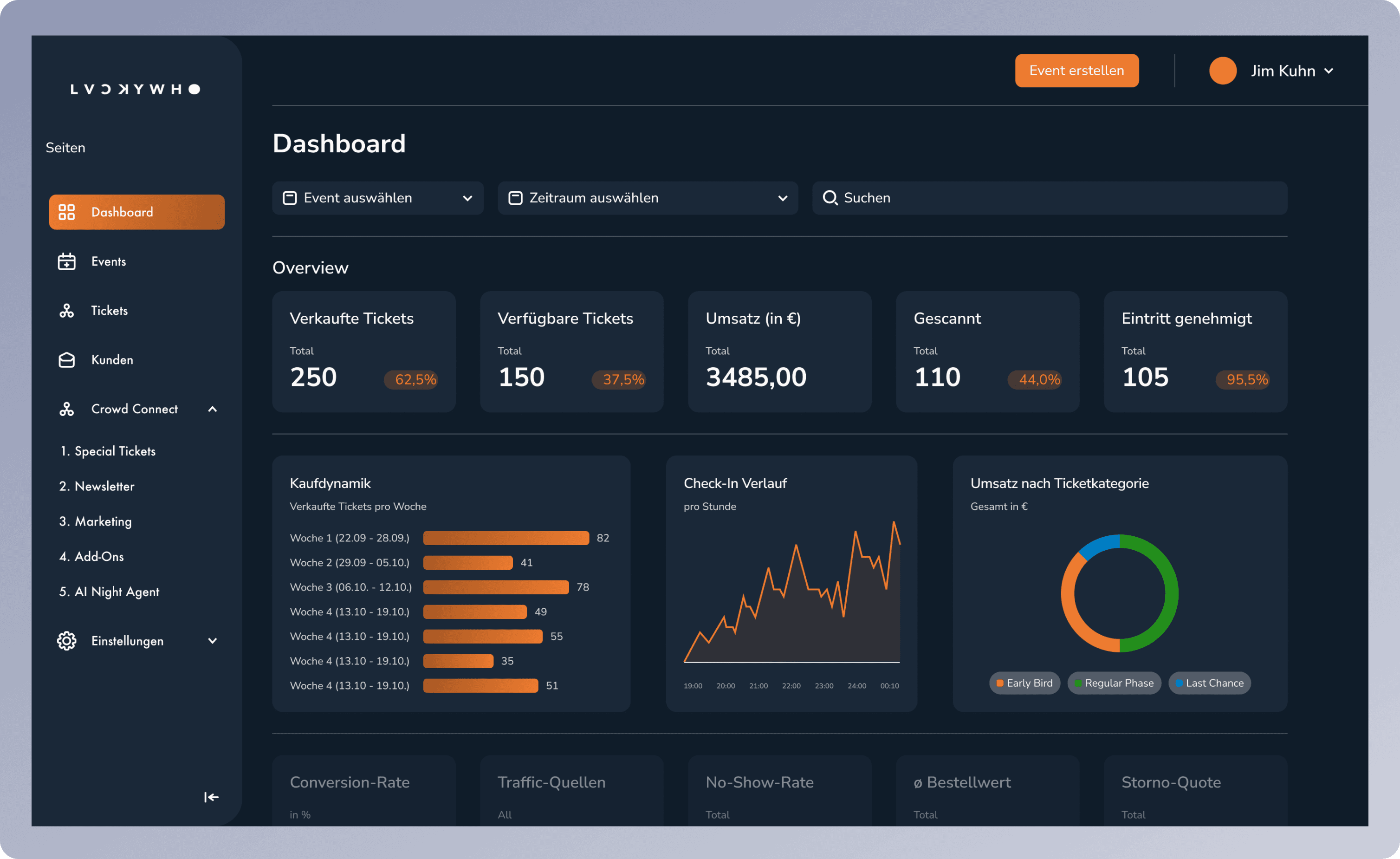 Die eigentliche Arbeit beginnt nach dem Event. Mit unseren KI-gestützten Automatisierungen verlierst du deine Gäste nicht mehr aus den Augen. Reaktiviere Besucher gezielt über automatisierte E-Mail- und WhatsApp-Flows, werte deine KPIs im Echtzeit-Dashboard aus und maximiere den Lifetime Value jedes einzelnen Gastes.